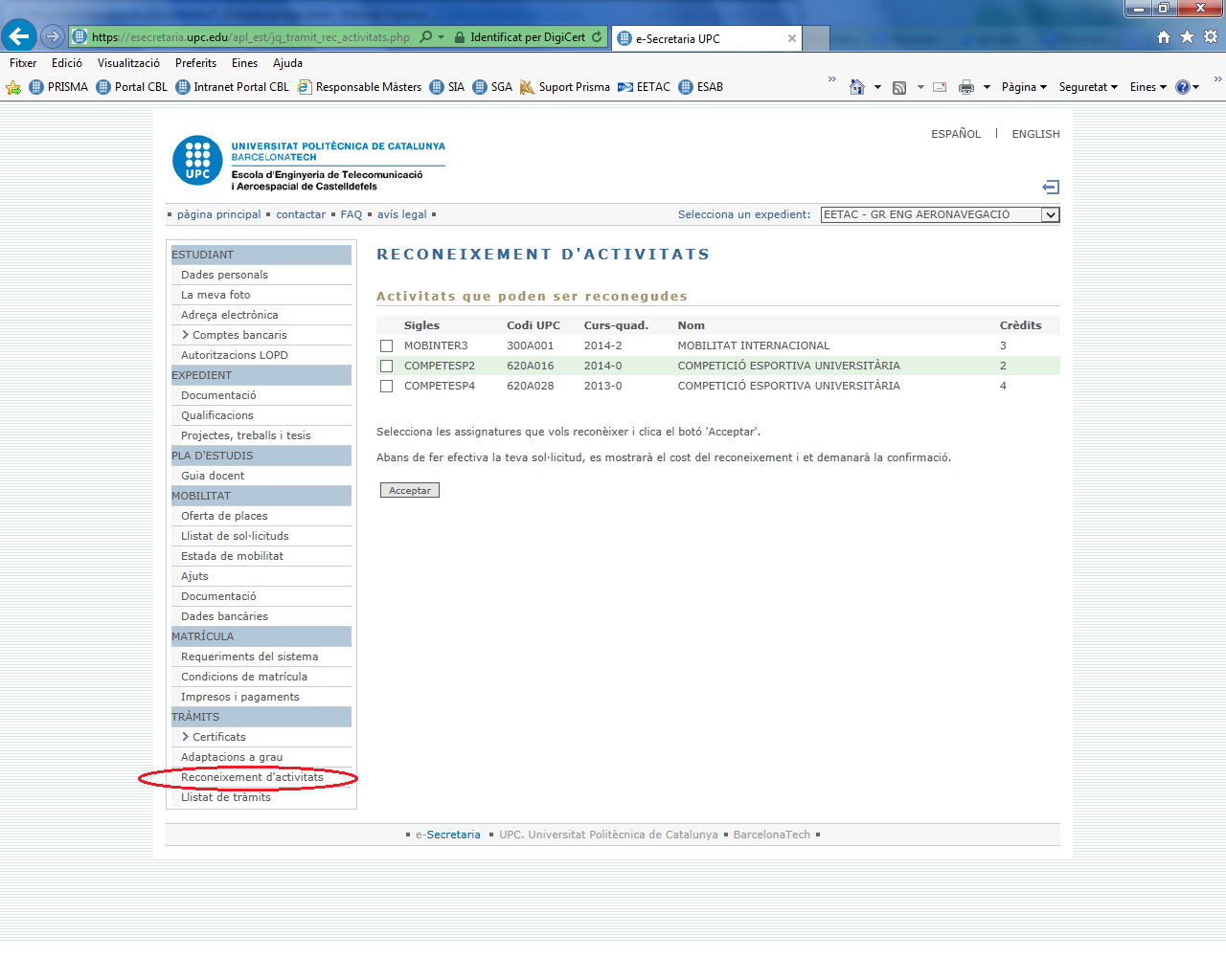 Visualització a e-secretaria de reconeixement d'activitats